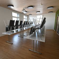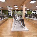 - Stühle auf Tische stapeln (6 pro Tisch auf 2er Stapel)